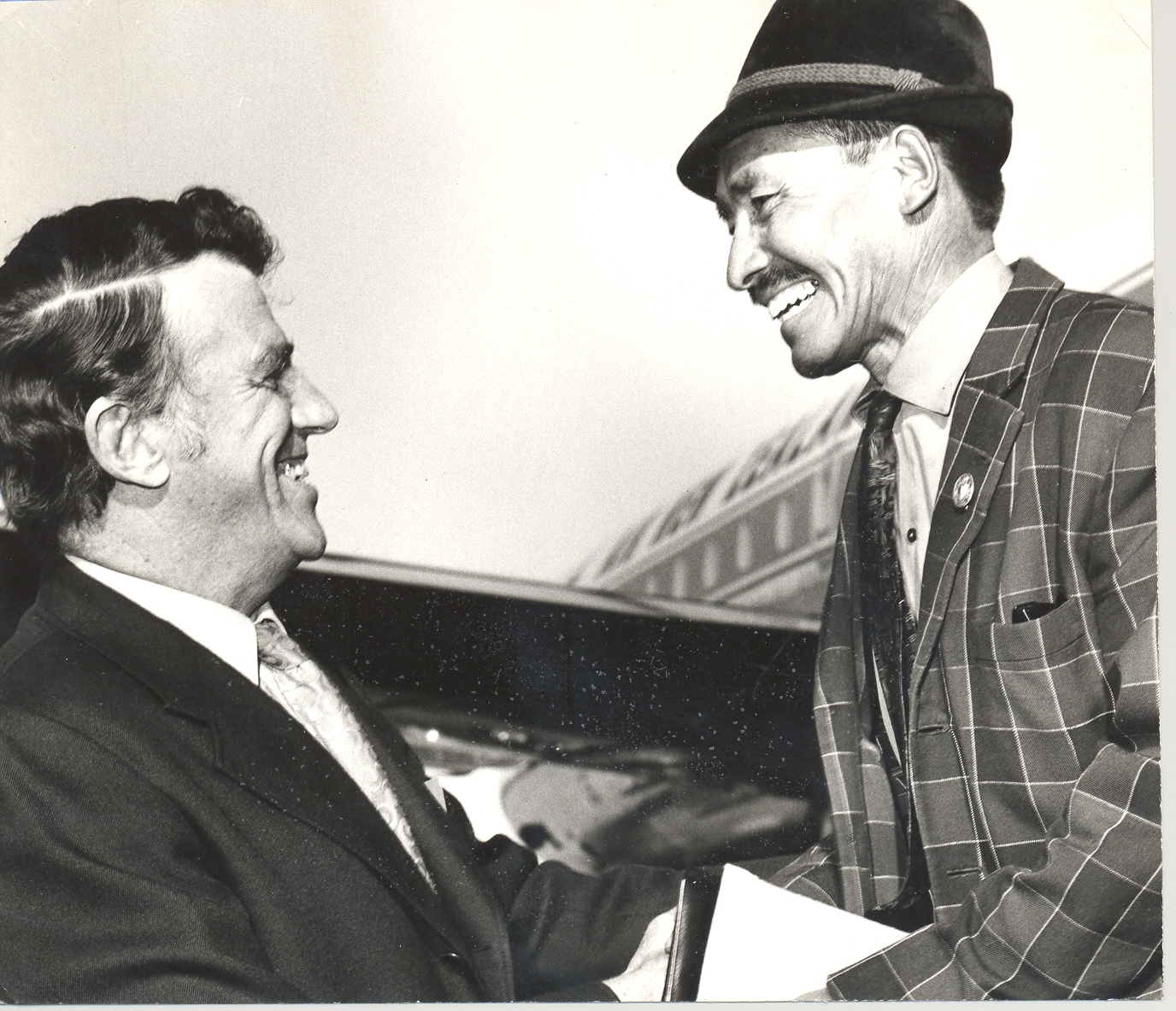Černobílá fotografie + Edmund Hillary & Sherpa Tenzing (Beside aircraft shaking hands in greeting or farewell, 1971) + pochází z Wikimedia Commons, kde má status – Creative Commons Attribution-Share Alike 3.0 Unported (autor: Kete Horowhenua : Horowhenua Historical Society Inc.).