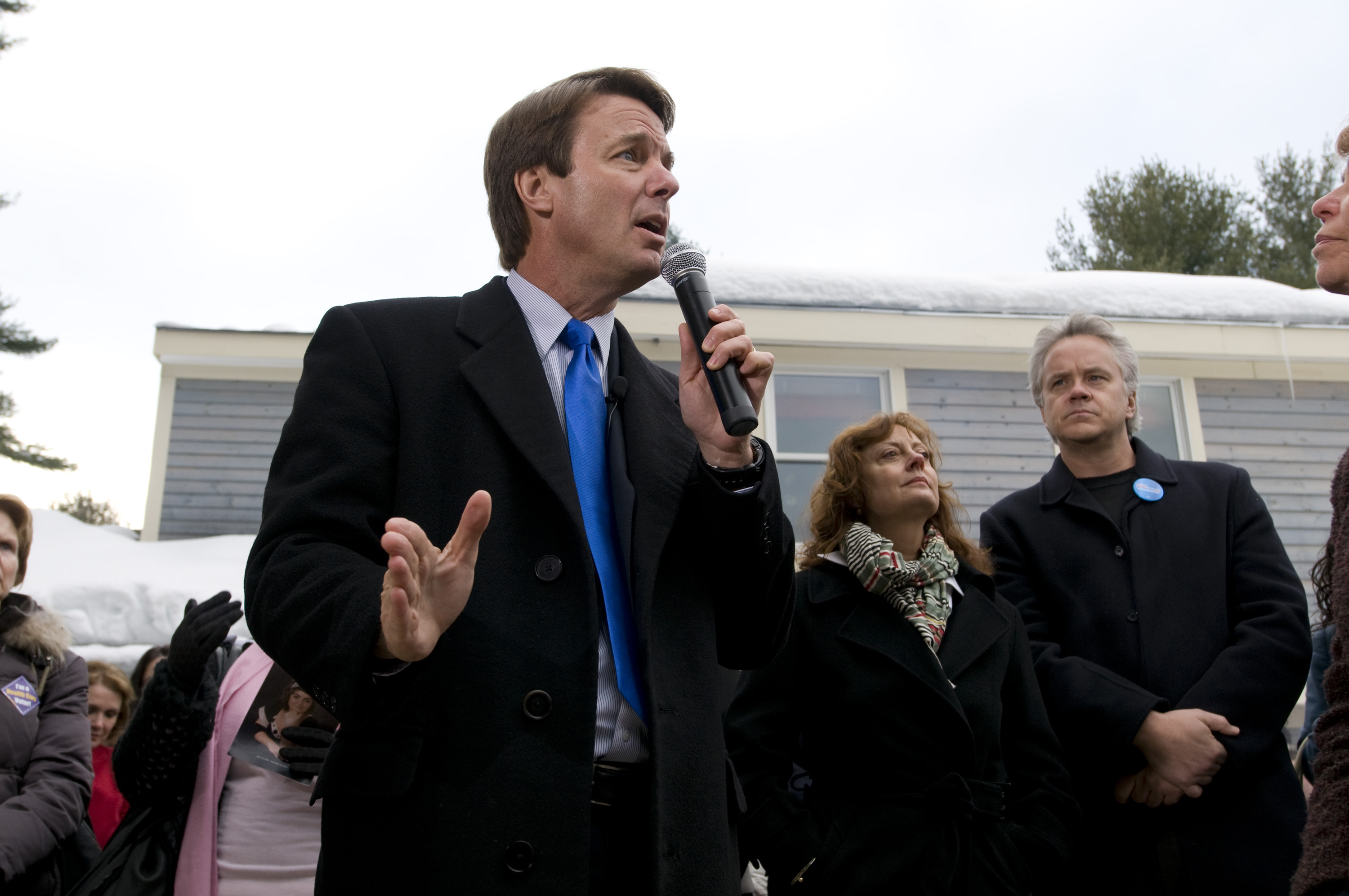 Fotografie + English: Bedford, NH, January 7, 2008: John and Elizabeth Edwards attended a house party at the home of Peter and Joanne Smith, in Bedford, NH. They were joined by actors Susan Sarandon, Tim Robbins and James Denton. Also joining them at the house party were Hilda, Grigort and Bedig Sarkisyan, the family of Nataline Sarkisyan, the 17 year old who died as a result of being denied a liver transplant by Cigma, a health insurance company. John Edwards answered questions from voters and media.