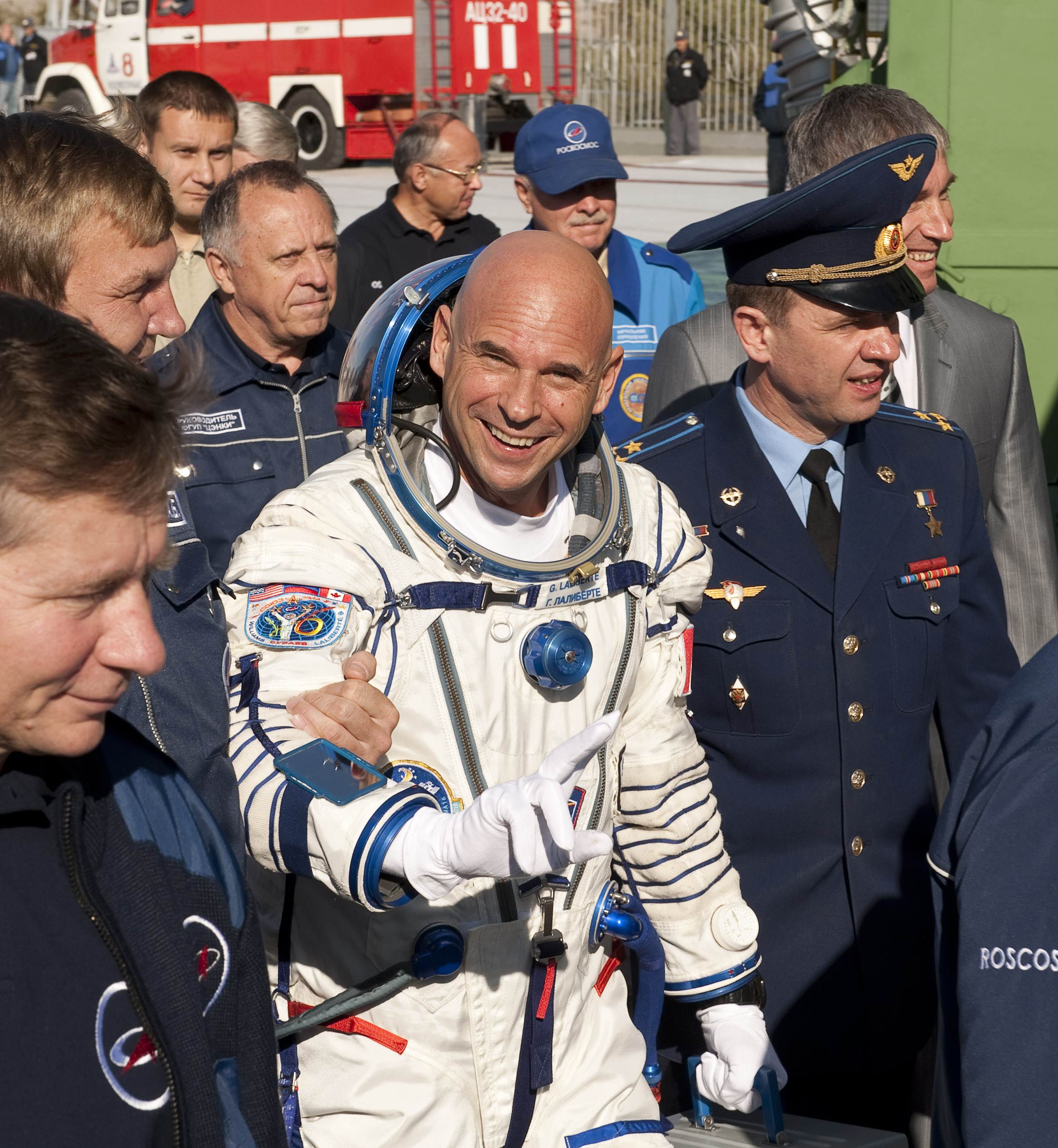 Spaceflight Participant Guy Laliberté, waves farewell as he and Expedition 21 Flight Engineer Maxim Suraev, and Expedition 21 Flight Engineer Jeffrey N. Williams walk to the Soyuz rocket and prepare to launch to the International Space Station (ISS), Wednesday, Sept. 30, 2009 in Baikonur, Kazakhstan. Photo Credit: (NASA/Bill Ingalls)