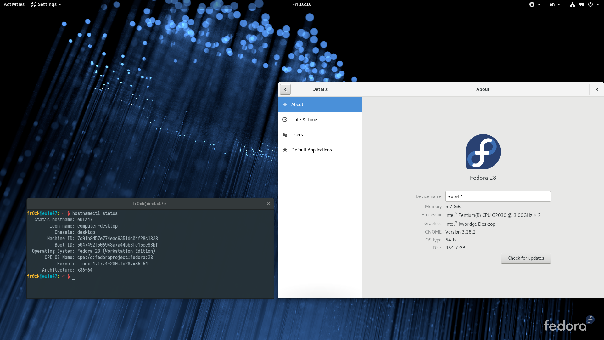 Snímek obrazovky + Description: Fedora 28 with GNOME running under Wayland compositor