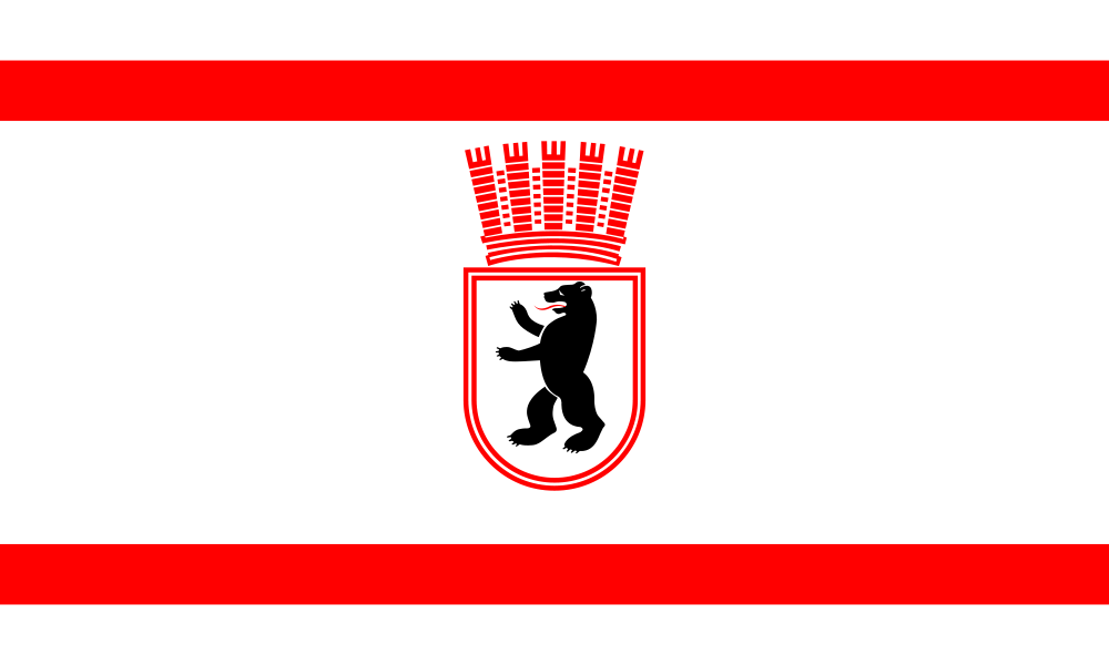 Oficiální vlajka bývalého německého města + Východní Berlín (Dienstflagge Groß-Berlins und Flagge in Ost-Berlin (sowjetischer Sektor Berlins) bis 1990) + pochází z Wikimedia Commons, kde má status – Public domain (autor: User:Madden).