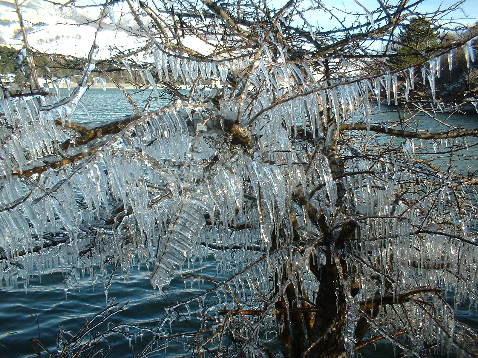 Fotografie + Description: Nebbia levatasi dal lago (che si vede sullo sfondo). La giornata soleggiata ha poi parzialmente fuso il ghiaccio che si è nuovamente formato (dando luogo ai piccoli ghiaccioli) quando si è alzato il vento.