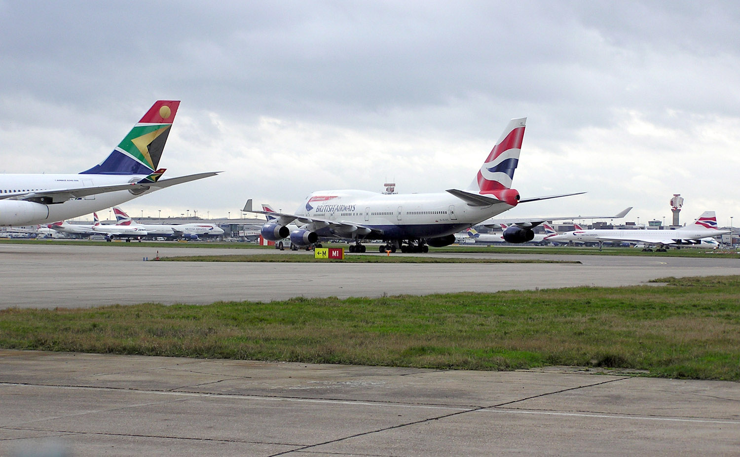 Fotografie + English: View across Heathrow Airport. The Concorde is G-BOAB in open-air storage. There at least nine British Airways tails in this photo (probably ten). The aircraft on the left is South African Airways