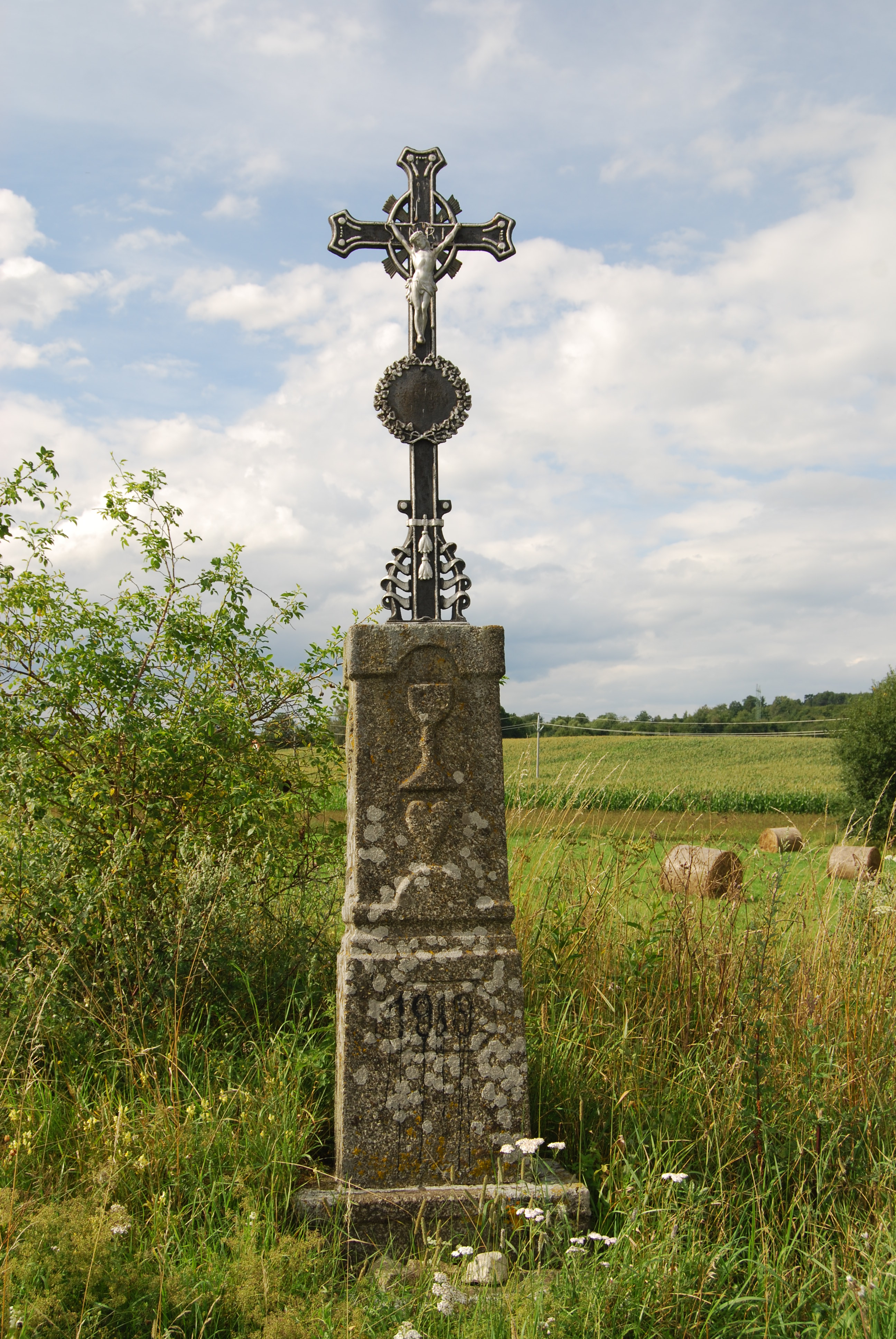 Fotografie + Čeština: Kříž u komunikace vedoucí do obce. Hubov je část obce Nadějkov v okrese Tábor.
