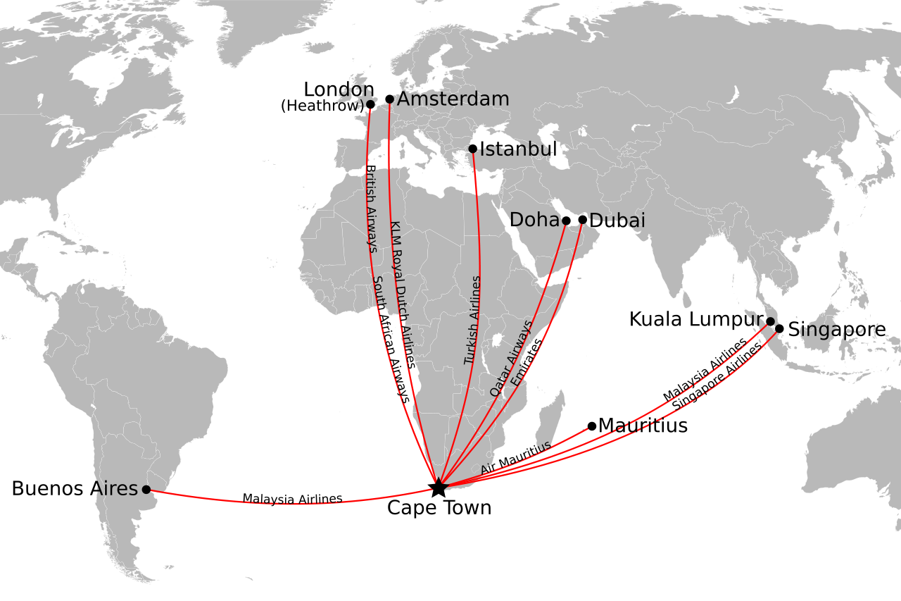 • English: Map showing flights from Cape Town International Airport to destinations outside Southern Africa, as of 1 July 2009.