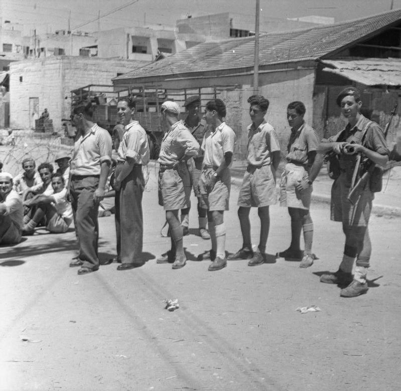 - English: A member of the Parachute Regiment stands guard over a group of Jewish civilians who wait in line to be interrogated by British army officers and members of the Palestine Police during a sweep in Tel Aviv for members of Jewish terrorist organisations such as the Irgun