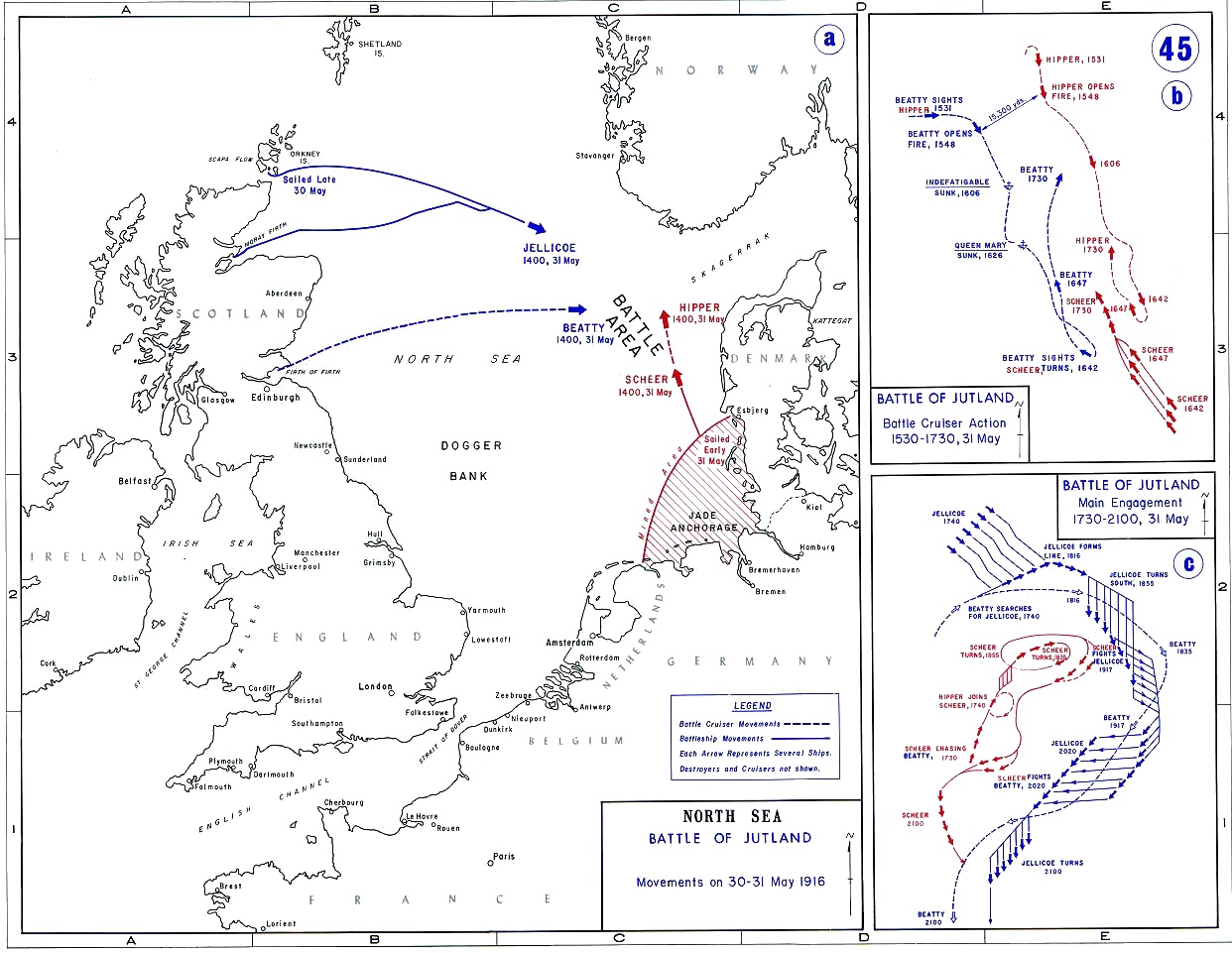 Mapa + Description: Map showing the movements of the British and German fleets during the Battle of Jutland in May 1916