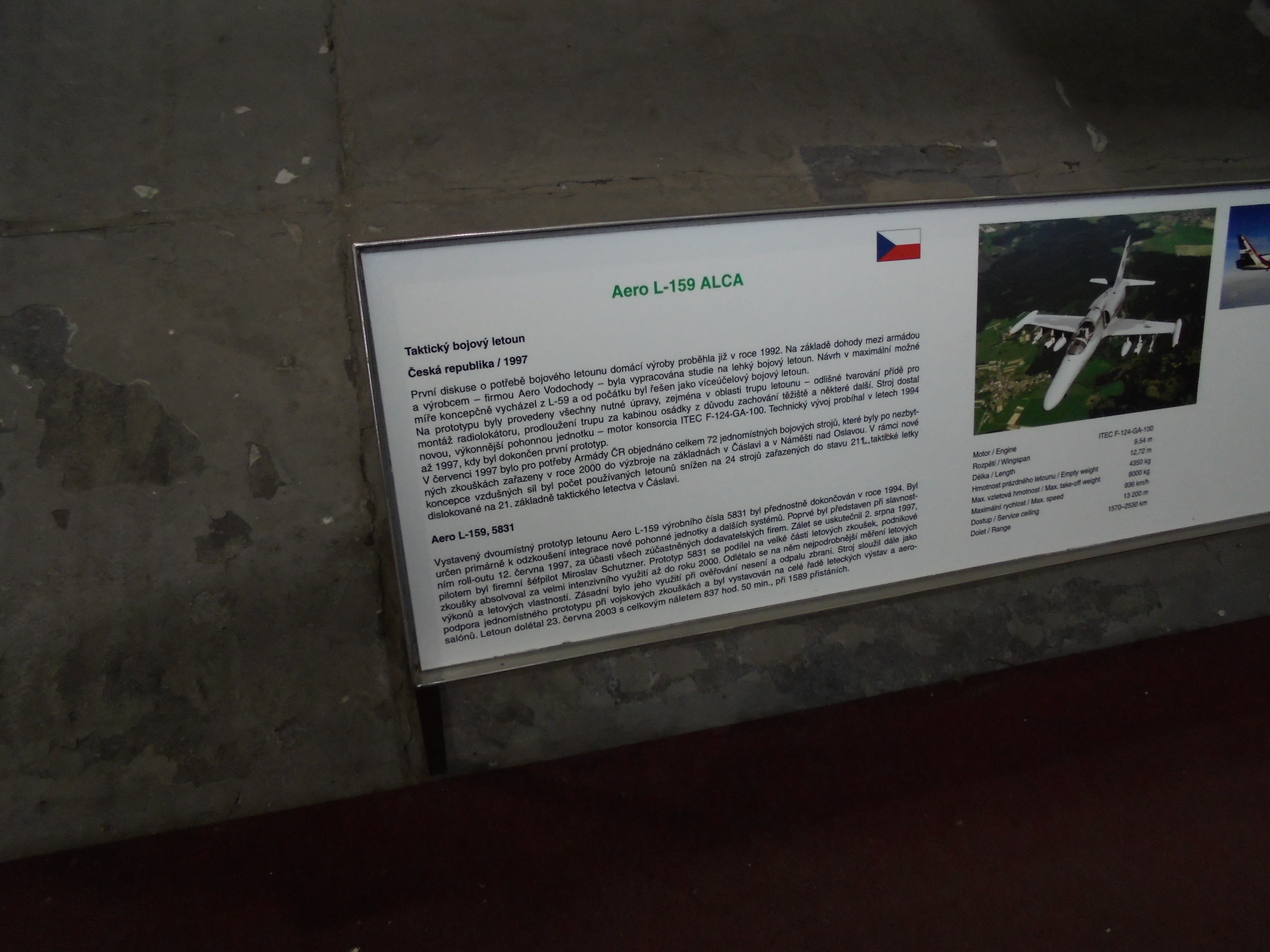 Fotografie + informační cedule k vojenskému letadlu – Aero L-159 Alca + pochází z mého výletu do muzea civilního a vojenského letectví ve Kbelích během září 2014.