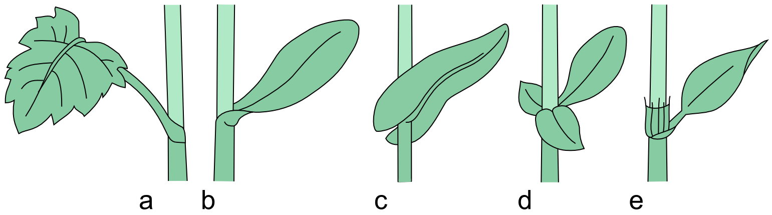 - Legenda: a) długoogonkowy, b) bezogonkowy lub siedzący, c) obejmujący łodygę, d) z przylistkami, e) ze zdrewniałymi przylistkami.