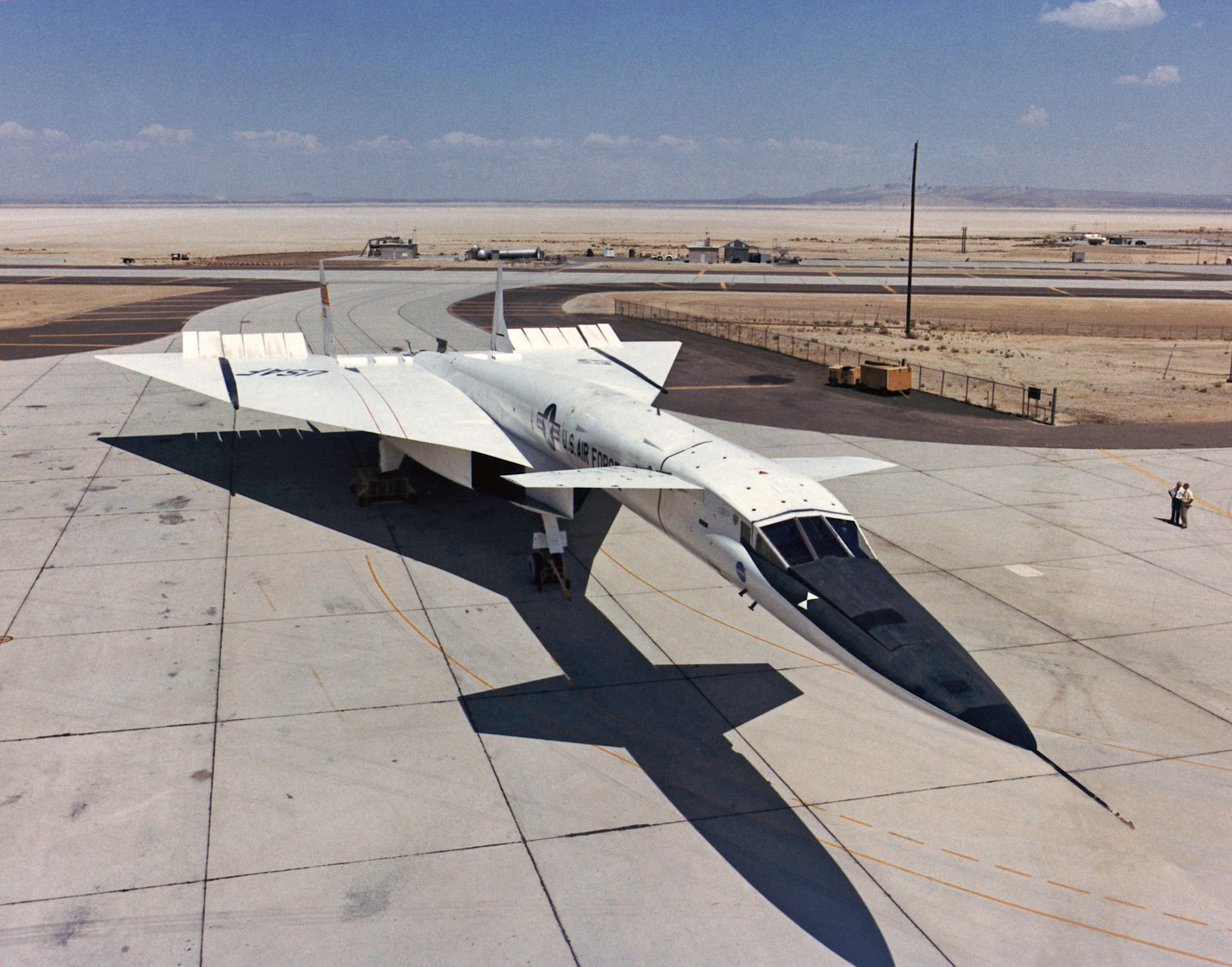 Originally designed as a Mach 3 bomber, the XB-70A never went into production and instead was used for flight research involving the Air Force and NASA's Flight Research Center FRC, which was a predecessor of today's NASA Dryden Flight Research Center. The aircraft's shadow indicates its unusual planform. This featured two canards behind the cockpit, followed by a large, triangular delta wing. The outboard portions of the wing were hinged so they could be folded down for improved high-speed stability.