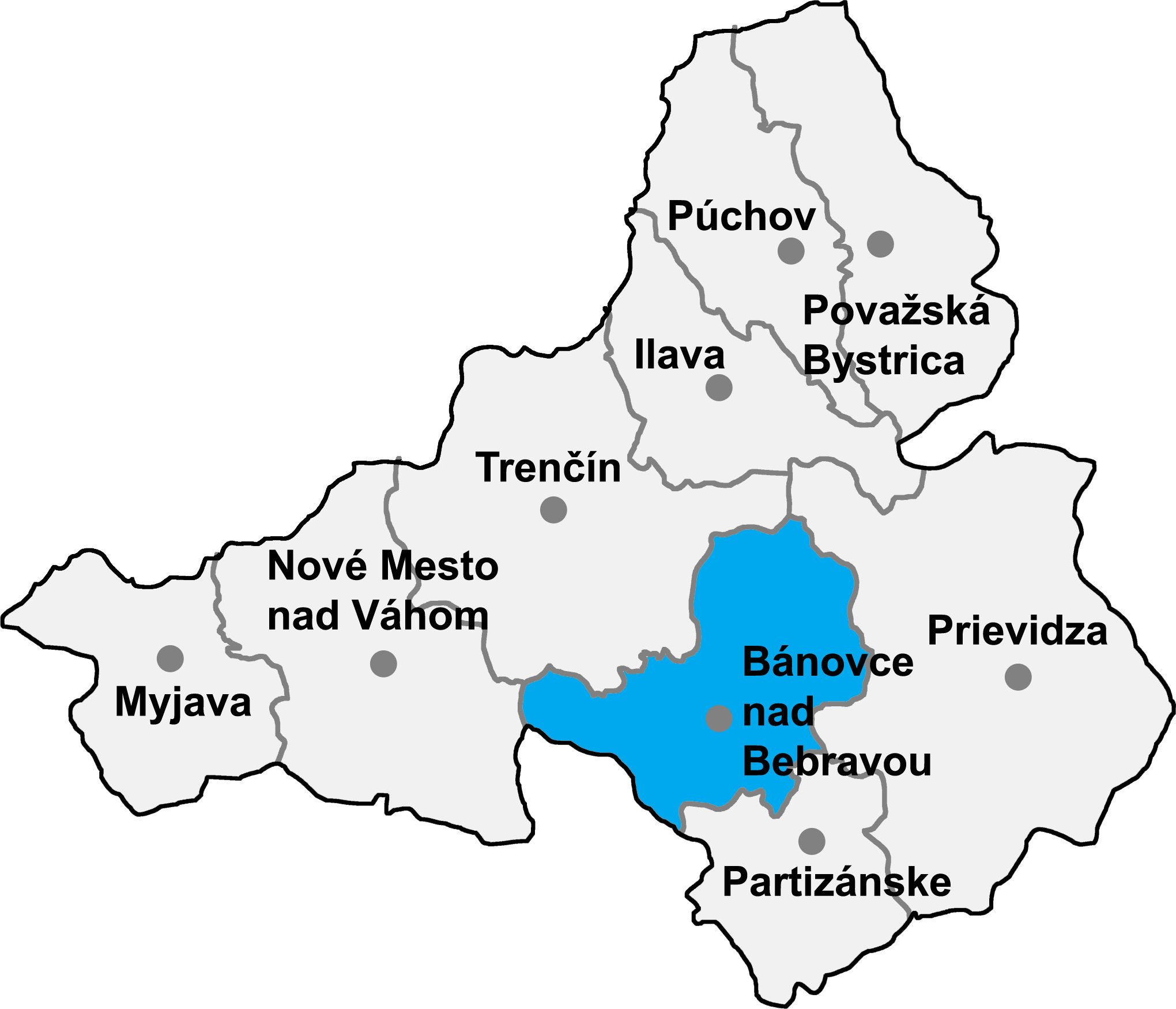 Mapa + English: map of the Trenčín region (Trenčiansky kraj) in Slovakia, district (okres) of Bánovce nad Bebravou highlighted