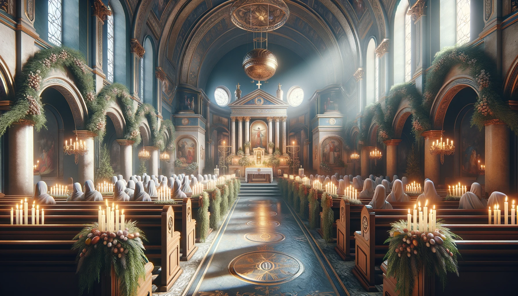 Fotografie + Deutsch: Osterstimmung in der Kirche mit Kränzen und Kerzen - Feierlicher Gottesdienst (Uploaded on January 3, 2024)