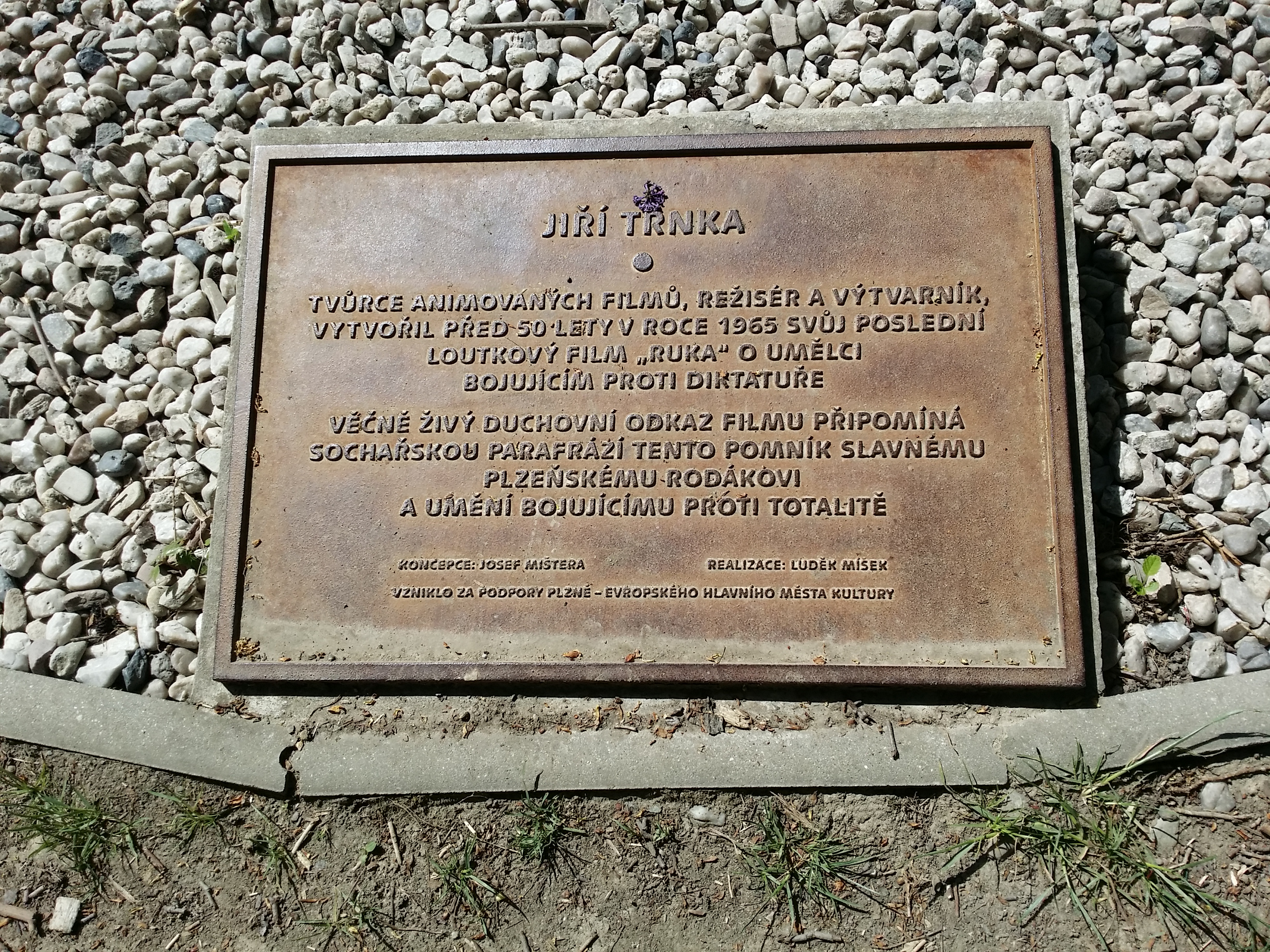 - Čeština: Pomník odkazuje na Trnkův poslední loutkový film „Ruka“ o umělci bojujícím proti diktatuře. Odhalen 19.11.2015, autor Josef Mištera.