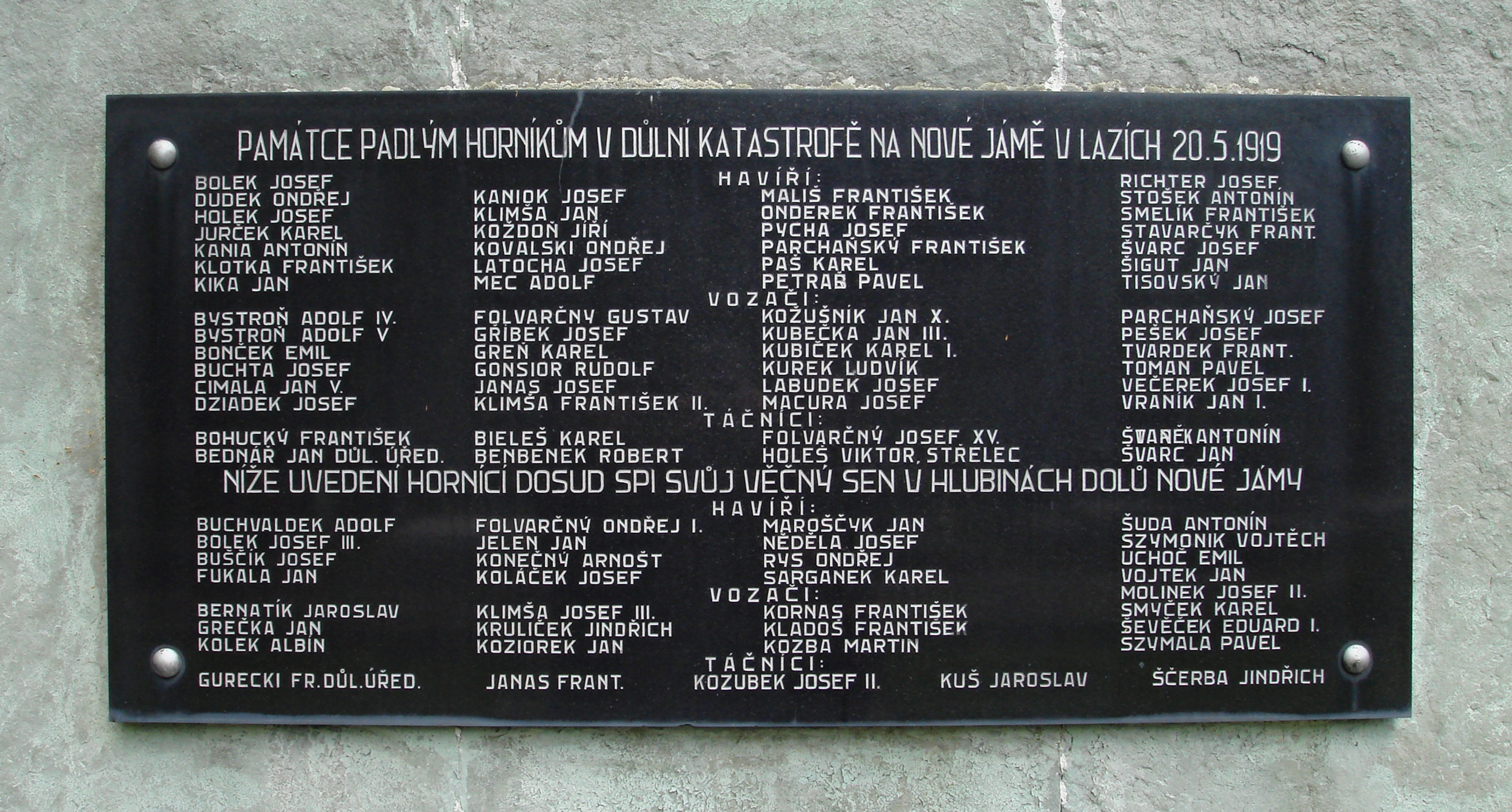 - Čeština: Pamětní deska v Orlové, připomínající oběti důlní katastrofy v Lazích 20. května 1919 (Moravskoslezský kraj, Česko).
