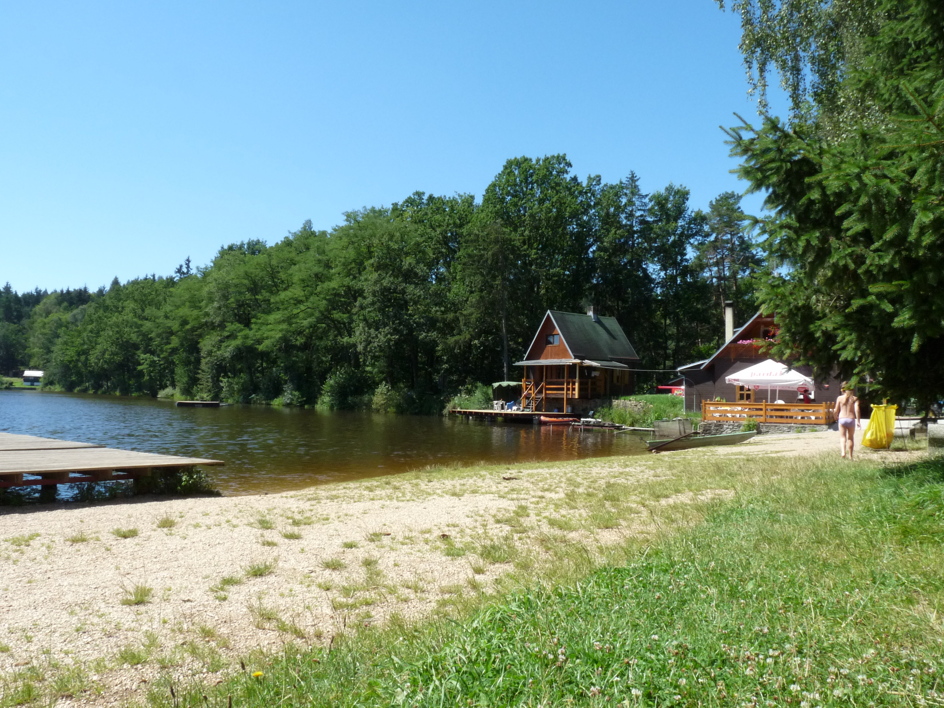 - English: Mrhal pond in Jivno and Hlincová Hora, České Budějovice district, Czech Republic, is a popular place to go swimming. This photo shows a pub on the bank.