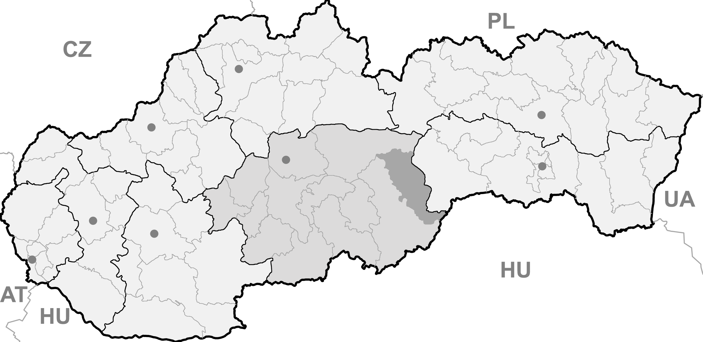Mapa + English: Map of Slovakia, Revúca district and Banská Bystrica region highlighted