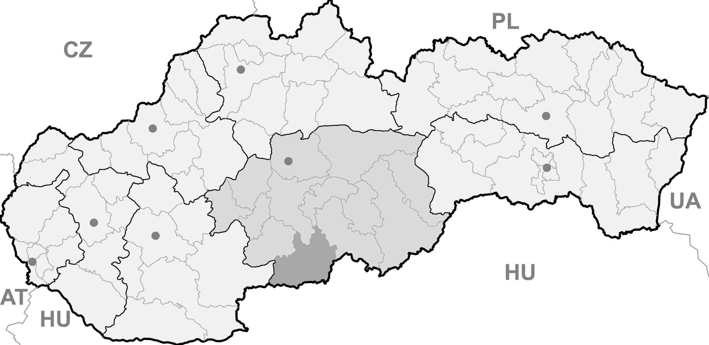 Mapa + English: Map of Slovakia, Velky Krtis district and Banská Bystrica region highlighted