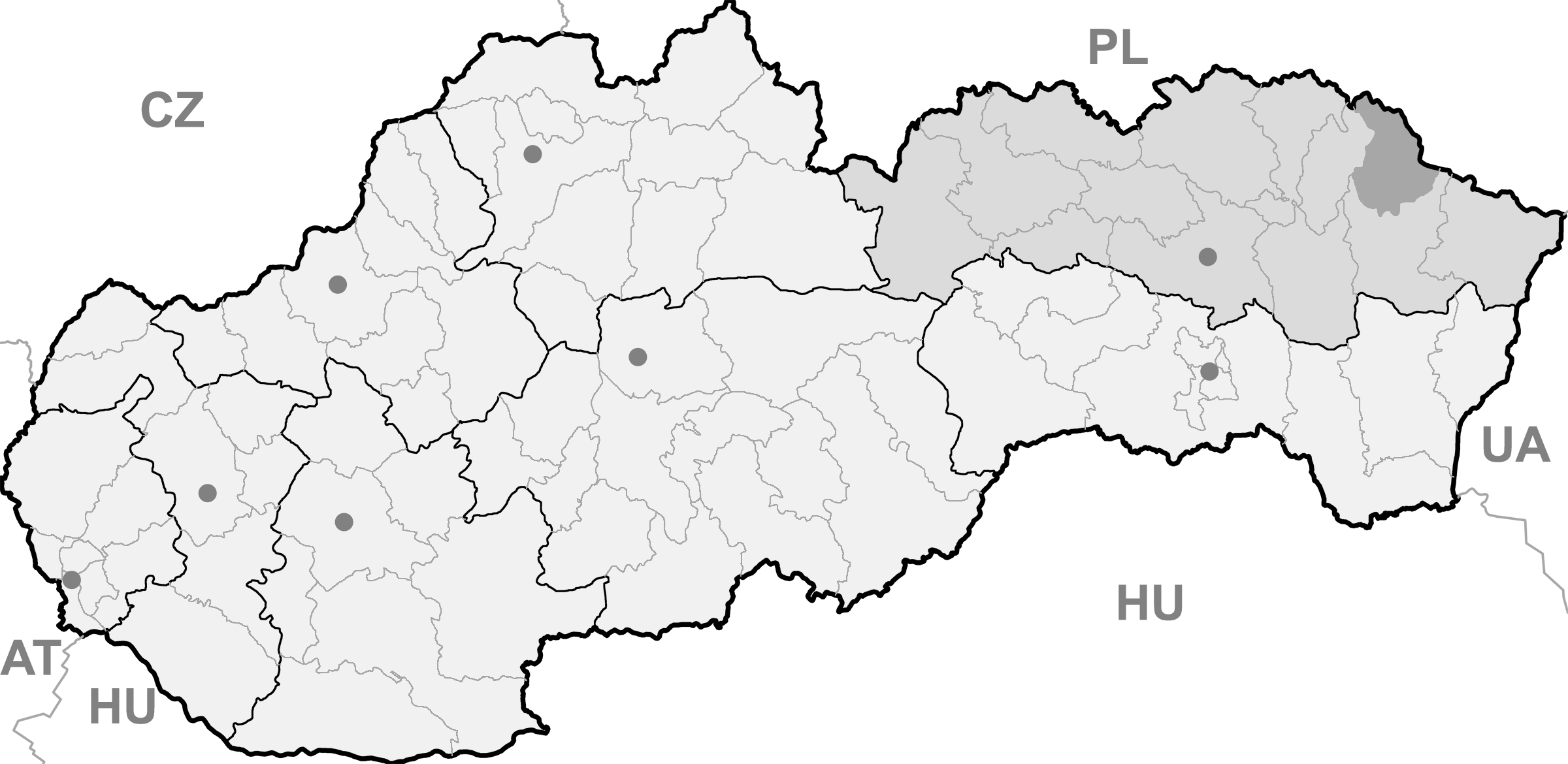 Mapa + English: Map of Slovakia, Medzilaborce district and Presov region highlighted