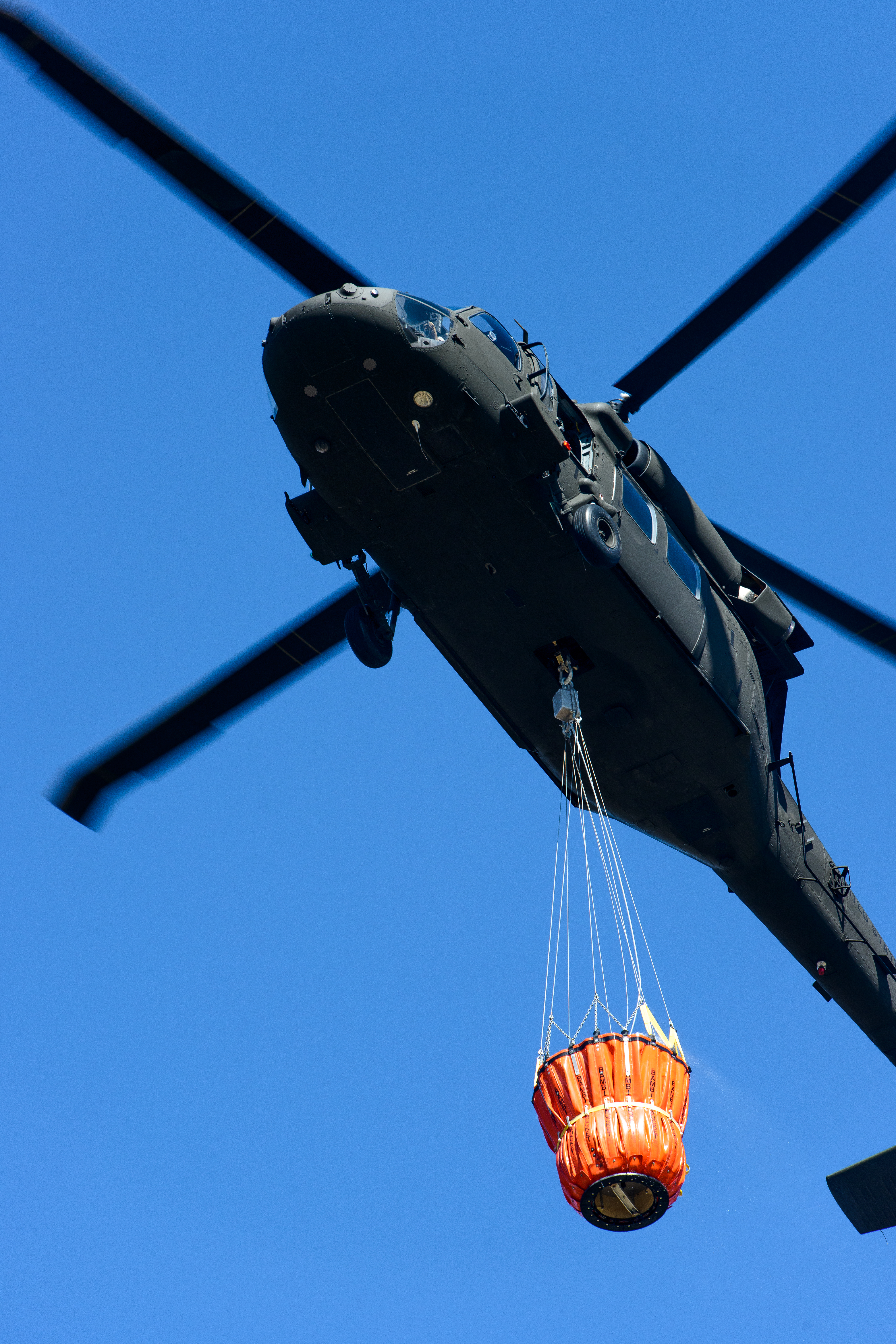 GIGANTICKÁ Fotografie + English: A North Dakota National Guard UH-60 Black Hawk helicopter uses a 600-gallon bambi bucket April 14 to suppress a wildfire south of Bismarck, North Dakota, near the residential area of Briardale.