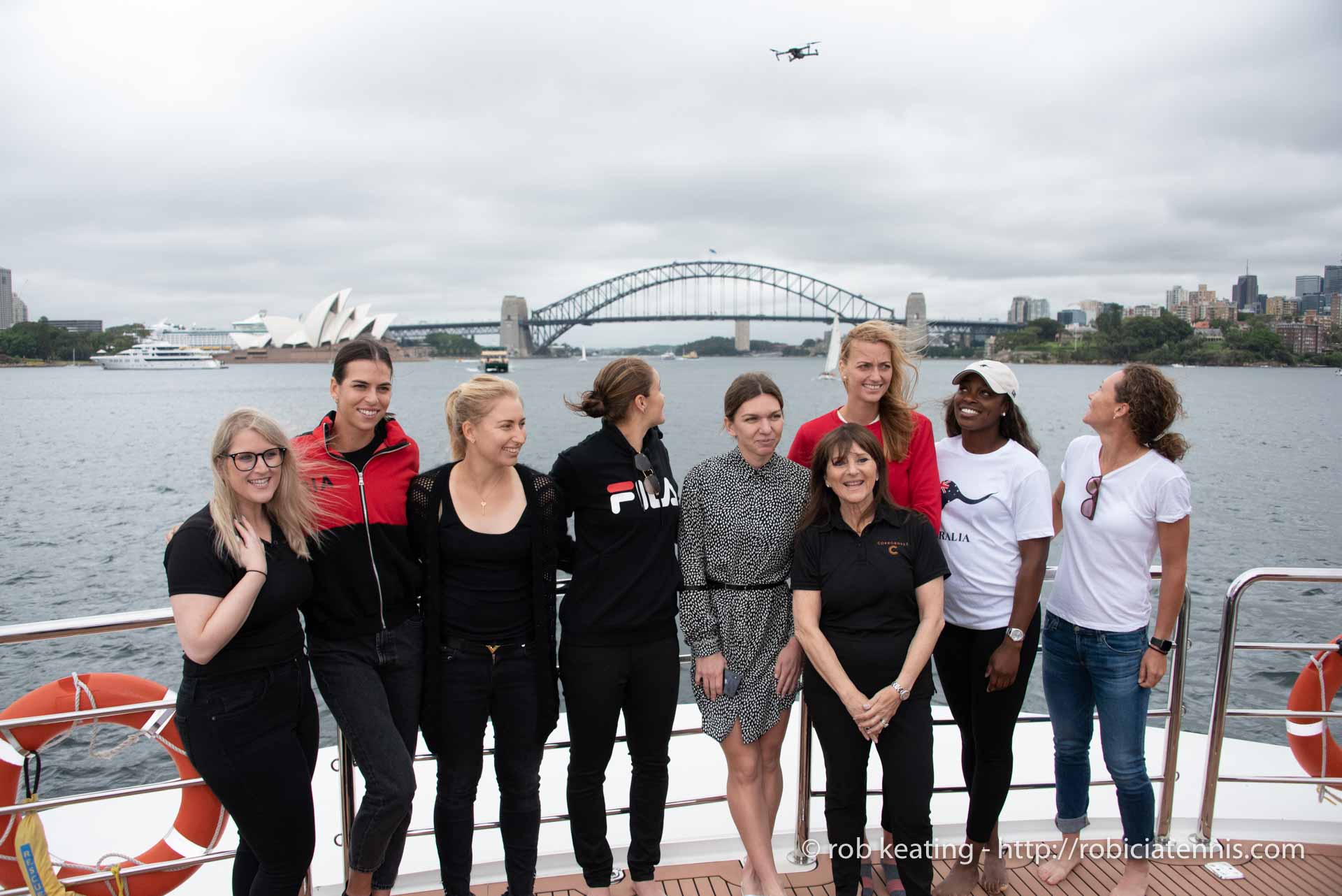 - Sydney, Australia - 6 January 2018: WTA players and staff from the 'Cooroboree. Ash Barty and Sam Stosur are looking up at a drone. (L to R) Ajla Tomljanovic, Daria Gavrilova, Ashleigh Barty, Simona Halep, Petra Kvitova, Sloane Stephens and Samantha Stosur on-board the super yacht 'Cooroboree' during a media opportunity for the Sydney International tennis. The Sydney Harbour Bridge is in the background. (Photo by Rob Keating/robiciatennis.com)