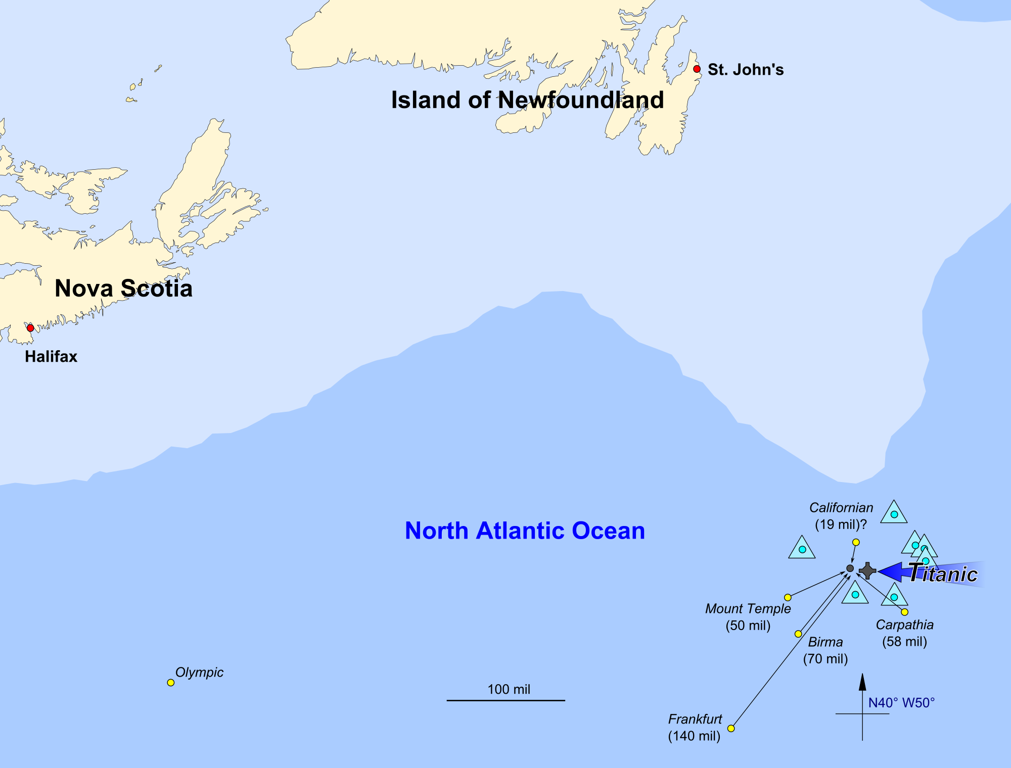 Mapka + Čeština: • křížek – poloha vraku Titanicu • tmavý bod – poloha Titanicu při vysílání CQD • trojúhelník – polohy hlášených ledovců • žlutý bod – ostatní lodě • červený bod – města