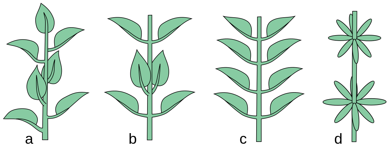 - Legend: a. alternate, b. opposite - decussate (rotation 90°) c. opposite - distichous (not rotated), d. whorled .