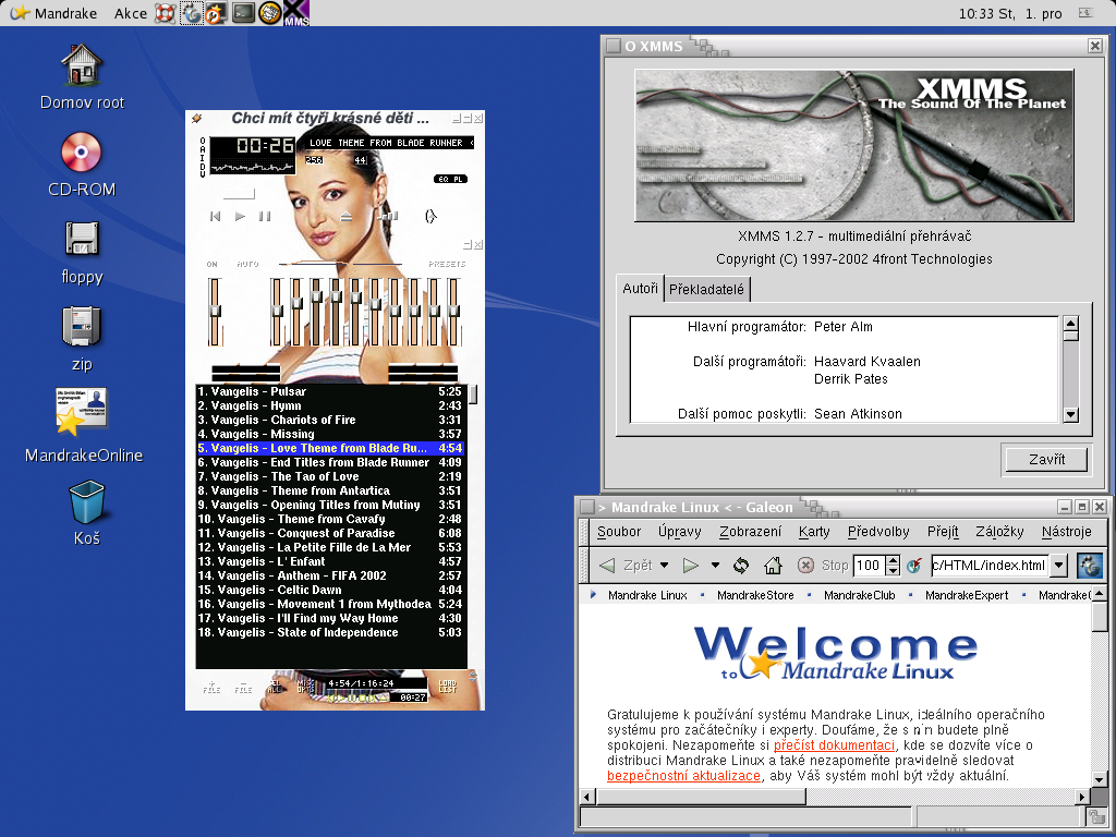 Snímek (obrazovky) + linuxového hudební přehrávače XMMS verze 1.2.7 v operačním systému Mandrake Linux 10.1 + pochází z jednoho z mých počítačů.