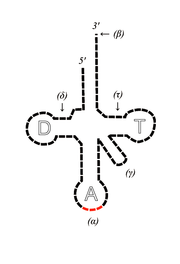 Terciární struktura všech tRNA připomíná písmeno "L" a tato trojrozměrná struktura je nutná k tomu, aby tRNA mohla nasednout do A a P místa na ribosomu).