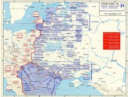 12. ledna 1945 zahájili Sověti viselsko-oderskou operaci a den poté konečnou fázi útoku na východní Prusko. Rudá armáda postupovala v Maďarsku, Polsku a na Slovensku, na jaře pronikla do Rakouska a na Moravu. 16. dubna začala bitva o Berlín, která skončila kapitulací berlínské posádky 2. května 1945. 8. května 1945 podepsali Němci za přítomnosti zástupců SSSR, USA, Velké Británie a Francie oficiální kapitulační akt, ovšem některé jednotky německých vojsk v Čechách a v Rakousku kladly odpor až do druhé dekády měsíce května, kdy zazněly poslední výstřely na východní frontě 2. světové války v Evropě.
