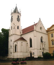 - Kostel sv. Jana Křtitele. Děkanský kostel stojí v dolní části Zámeckého náměstí. Byl postaven r. 1585 na místě starší stavby. R. 1645 byla průčelní západní věž zasažena bleskem. Požárem byly některé zvony zničeny. R. 1659 sem byly dodány tři nové, které vyrobil zvonař Mikuláš Löw.[1] Jeden z nich je v kostele dodnes, druhý byl zřejmě v důsledku válečných rekvizic přesunut do kostela sv. Cyrila a Metoděje v Praze na Karlíně,[2] třetí je nezvěstný. Dále se na věži nachází zvon z r. 1540 od Wolfa Hilgera a zvon z r. 1482 od Hanuše Konváře. Sanktusník kostela, lucerna i postranní věžička jsou prázdné. Nad zvonovým patrem se nachází byt věžníka, dnes prázdný.