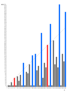 Přirozená čísla od 1 do 40 a hodnoty součtů jejich dělitelů s(n); abundantní čísla znázorněna modře