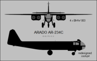 V únoru 1944 byl vyzkoušen stroj Ar 234 V8, prototyp čtyřmotorové verze Ar 234C s motory BMW 003A a časem byly do zkoušek zařazeny další letadla s různým uspořádáním motorových gondol pod křídly. Nakonec bylo přijato rozhodnutí umístění dvojic motorů pod křídly vedle sebe ve velkých motorových gondolách a o využití zatahovacího podvozku; také se experimentovalo s prosklením kabiny, ale k dokončení prototypů základních verzí-víceúčelové C3, bombardovací C2 a dálkově - průzkumné C1 už nepřišlo.