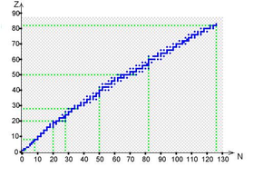- Žádné stabilní nuklidy nemají počet neutronů 19, 21, 35, 39, 45, 61, 89, 115, 123 nebo ≥ 127.