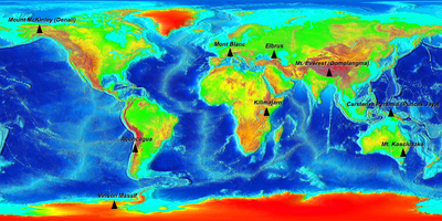 Vrcholy Seven Summits, mapa ukazuje devět možných vrcholů, podle různých definic kontinentálních hranic.